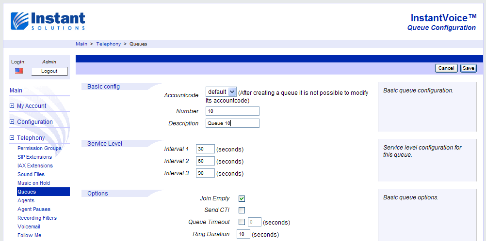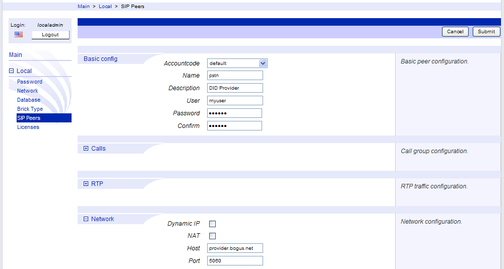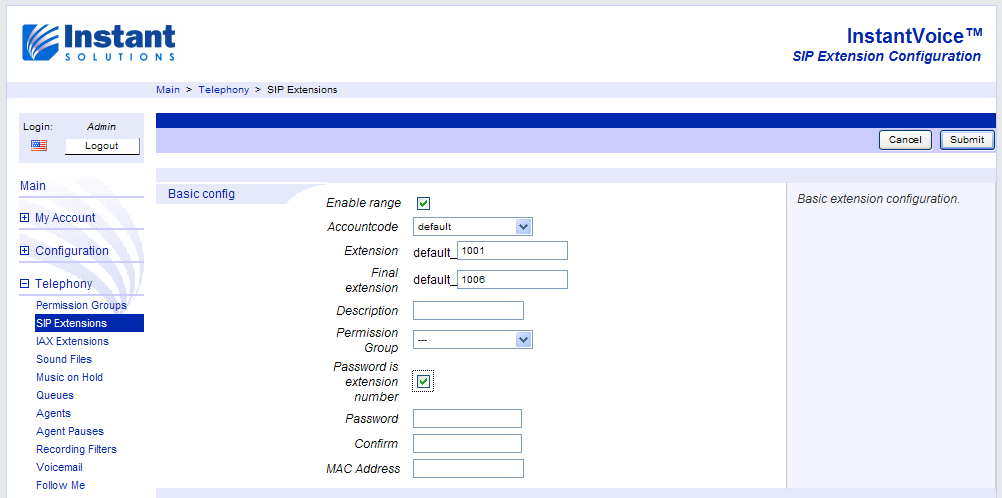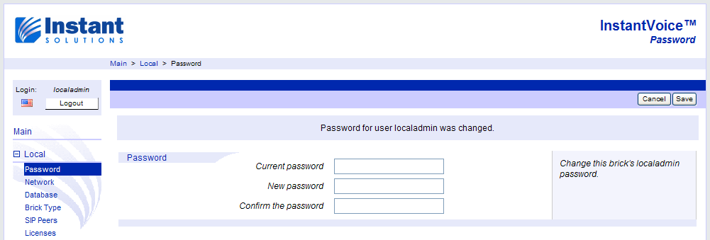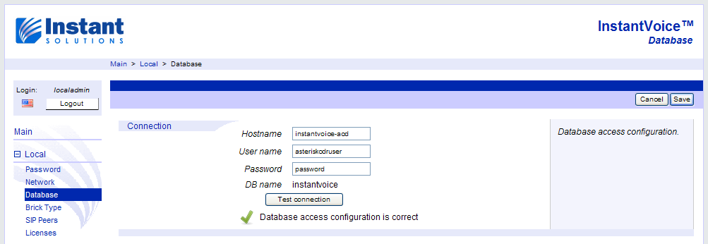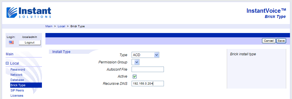 Each InstantVoice installation comes with two pre-configured web users, localadmin and admin. The first one, localadmin, is used to configure any and all features specific to each brick in the cluster, such as network addresses or the brick’s type. It is accessible on all bricks. The second one, admin, is only accessible on the ACD itself (or on Standalone bricks which are also ACDs), and is used to access and configure cluster-wide features, such as SIP extensions. More on this later on, under Configuring the Cluster.