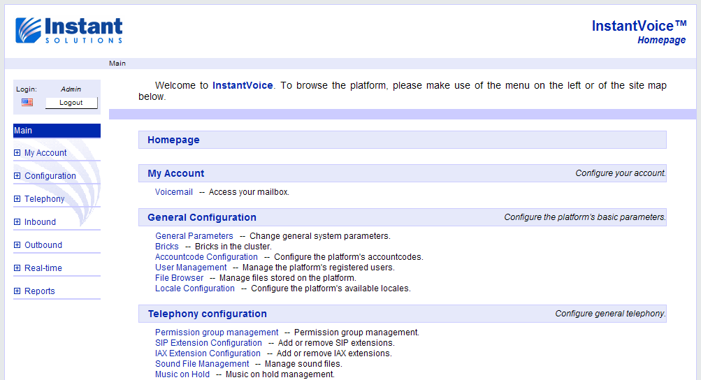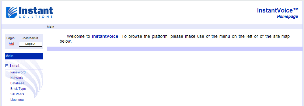 To start configuring the ACD server, point you web browser to the IP address of the ACD which you specified during installation, in this case, http://192.168.0.50. You will be presented with the InstantVoice homepage.