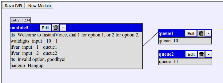 dropdown empty: this tells the IVR to jump to the “Queue” module if a “1” was