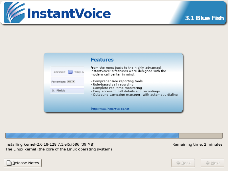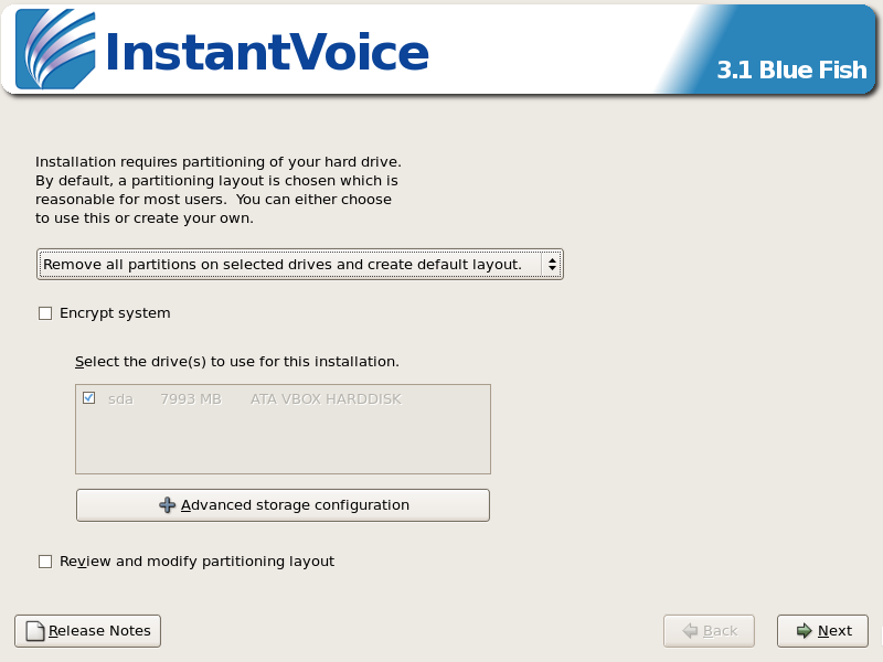 This will erase everything on the disk(s), but the added space and reduced complications will be welcome if this installation is to be used in production. The rest of this guide will assume you chose this last option. If you wish to only use a part of your disk for installing InstantVoice, separate at least 8 Gb for the task.