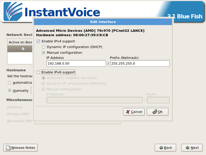 For illustration purposes this guide will use the 192.168.0.0 IPv4 range, so from here on down the ACD’s IP address will be referred to as 192.168.0.50, and its netmask 255.255.255.0. Nevertheless, you can enter a valid IP address and Netmask of your choice, taking note of the values for use later on during configuration. And unless your network uses IPv6, disable it here.